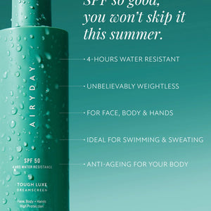 Tough Luxe SPF50 is tested for up to 4 hours of water and sweat resistance, making it ideal for swimming, workouts, and long days outdoors. For optimal protection, we recommend reapplying every 2 hours, and always after swimming, towel-drying, or excessive sweating